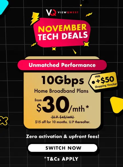 Future-proof your home with XGS-PON fibre broadband—built for today’s needs and tomorrow’s demands. Give your home the best it deserves with the unbeatable value of XGSPON broadband from just $30/month. With ViewQwest X, leverage Singapore’s fastest and most secure broadband, offering speeds up to 10Gbps, paired with next-generation WiFi 7 devices. Enjoy seamless connectivity nationwide and elevate your online experience to new heights!